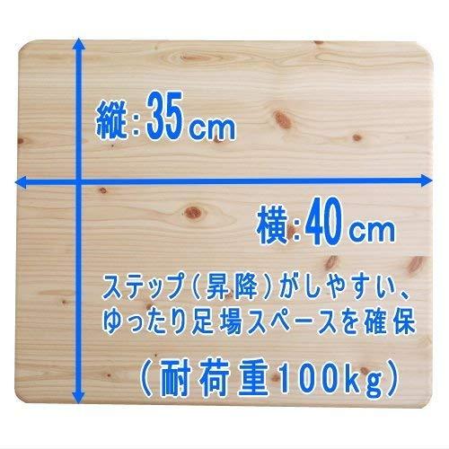 商品情報 用途:スポーツ、リハビリ用として作られた木製のステップ(踏み台昇降)台です。シニア世代でも長い時間、ニコニコペースで負担なくステップできるよう高さも10cmと設定。 ・運動方法・効果:毎日10分(1回〜3回)を目標にご利用ください。ステップ運動を続けることは、ダイエットはもちろん『つまづき』などを軽減させる大腰筋、大腿四頭筋、腹筋、背筋、大殿筋などが鍛えられます。 ・サイズ・重量:幅40cm×縦35cm×ステップ台高さ10cm (重量/約2.1kg) ・材質:天然ひのき材使用/耐荷重:100kgまで使用可能)/ 日本製 ・セット内容:本体×1台、簡易すべり止めマット×1枚(色は予告なく変更になる場合があります)、ステップ目標管理シート(1ヵ月)×A4サイズ×3枚、簡単エクササイズDVD 組立不要、すぐにお使いいただけます。 |